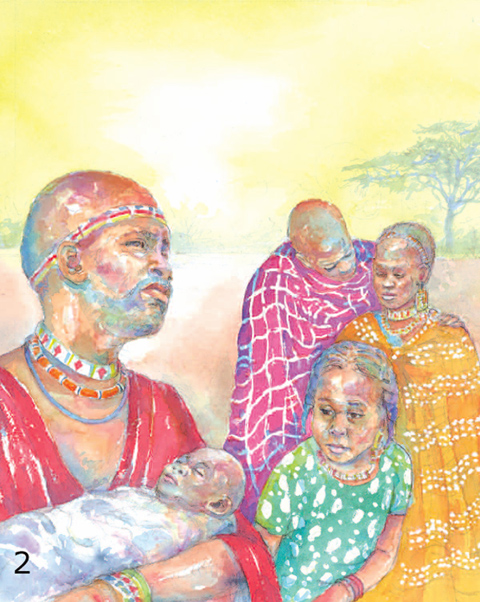 God – called “Mola” –  shows up but he’s in a grumpy mood.  The humans are making such a racket he can’t hear himself think.  “All I want is some peace, some quiet,” he complains.  But before you know it, the girl takes Mola by the hand and invites him to join the ceremony for her baby brother.